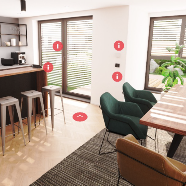 Über die Räume verteilt werden Sie immer wieder auf Legrand-Produkte stoßen, die mit einem „i“ gekennzeichnet sind. Durch einen Klick auf diese Info-Points erhalten Sie zusätzliche Informationen über das verbaute Produkt, entdecken Produktvarianten, Installationshinweise und hilfreiche Energiespartipps.